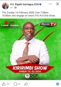 Gachagua has invited the public to watch him live on Inooro TV during the Kiririmbi show, which will run from seven in the evening to ten at night. He shared the message through his official social media platforms, saying the program will give him a chance to speak directly to citizens and address key national issues.