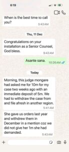He further alleges that when the full amount was not delivered, the court issued unfavourable rulings against his clients, including jail terms, despite what he says were directions from the Court of Appeal. These claims also remain unverified in official proceedings.