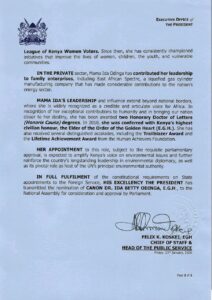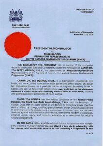 “His Excellency the President has, in exercise of the prerogative vested in the Head of State and Government, caused the nomination of Canon Dr Ida Betty Odinga, E.G.H., for appointment as Ambassador/Permanent Representative of the Republic of Kenya to the United Nations Environment Programme (UNEP),” the statement read in part.