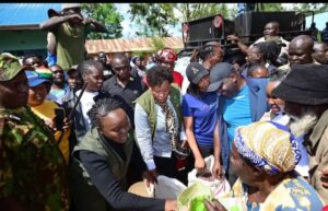 Environment CS Deborah Barasa during food distribution to victims of Elgeyo Marakwet mudslide tragedy. Photo Courtesy