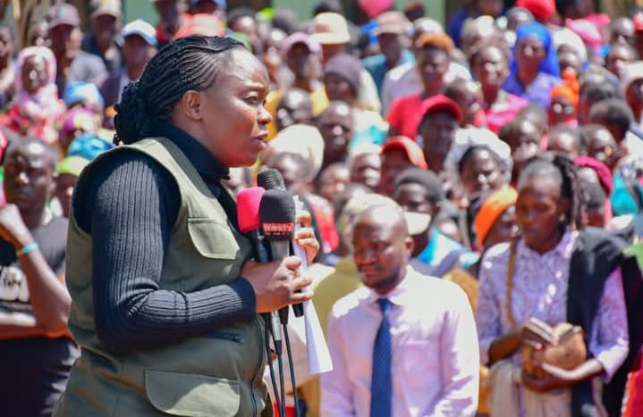 Environment CS Deborah Barasa during food distribution to victims of Elgeyo Marakwet mudslide tragedy. Photo Courtesy