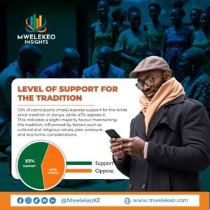 Mwelekeo Insights has also conducted polls on other social topics, including bride price and marriage trends where 53%  of men support the bride-price tradition, while 47% oppose it.