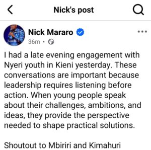 In a recent Facebook post, he shared details about a late evening meeting he had with young people in Kieni, one of the areas in Nyeri.