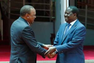 The Famous handshake between Raila Odinga and former president Uhuru Kenyatta. Photo Courtesy/File