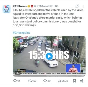 According to a report by KTN News, investigators discovered that a vehicle believed to have transported and supported the group behind the assassination is registered to an assistant police commissioner.