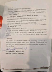 “The Council of Governors notes with great concern the continuous and escalating extortion, political witch-hunt, harassment, intimidation and humiliation of Excellency governors by certain Senators when they appear before the Public Accounts Committee of the Senate,” said Abdullahi.